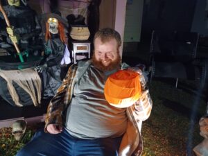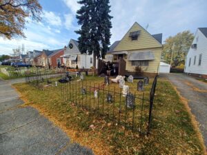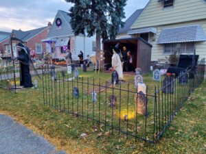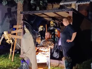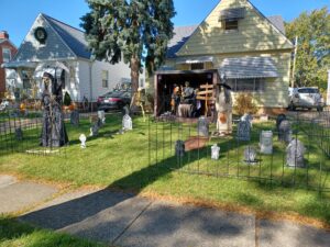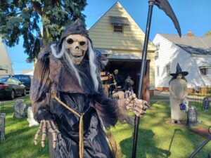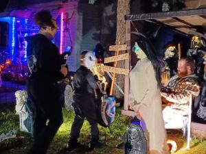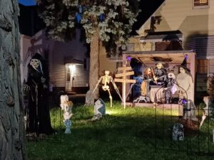 Our display gets bigger every year! The first few photos are of what things looked like the two weeks leading up to Halloween. About two hours before the big event, a huge wind came through and sent everyone’s displays flying! I had three paver blocks on each of the animatronic bases and they still got knocked over! Luckily I got home in time and everyone scrambled to put things back together. The wind was pretty strong most of the night, but the rain held off until after 8. We ended up passing out more than 600 pieces of candy!
